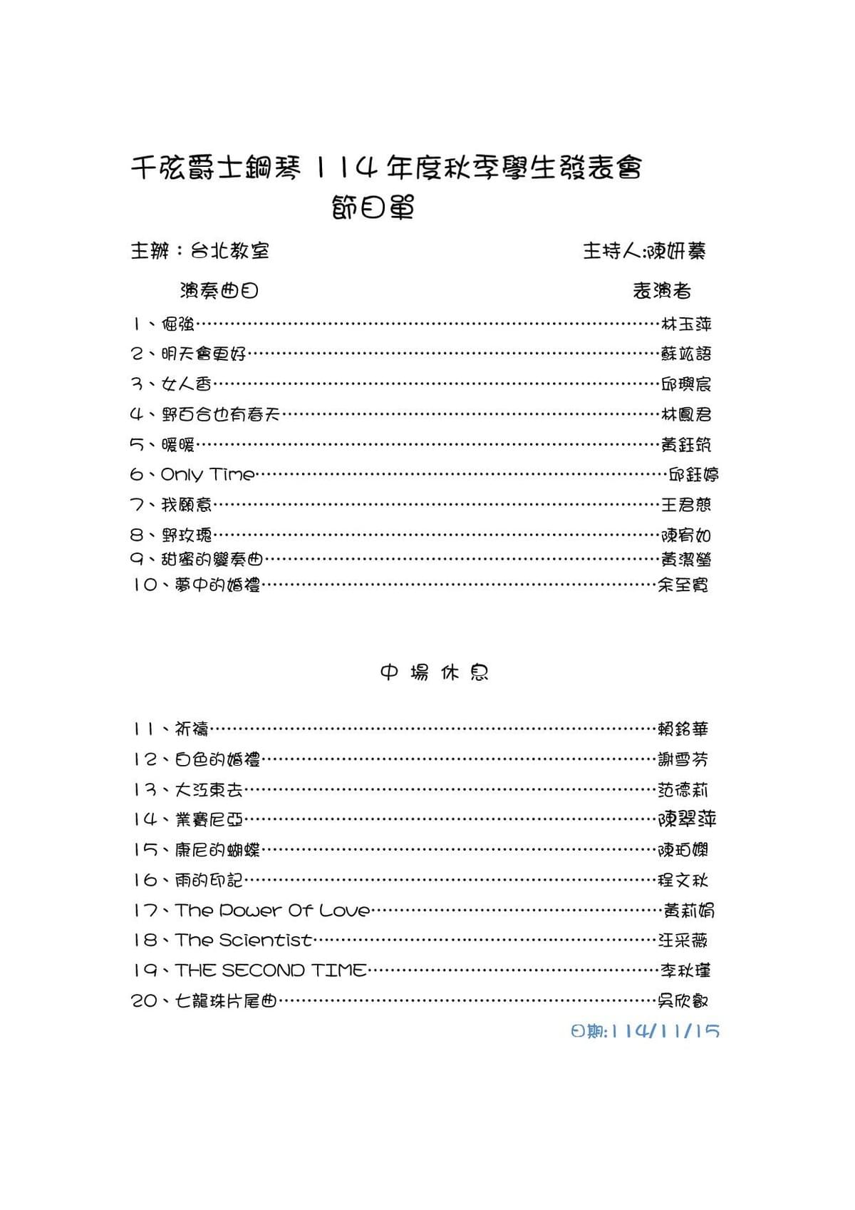二 、下午06:00開始正式演奏,由主持人報幕學生們依序上台彈奏。